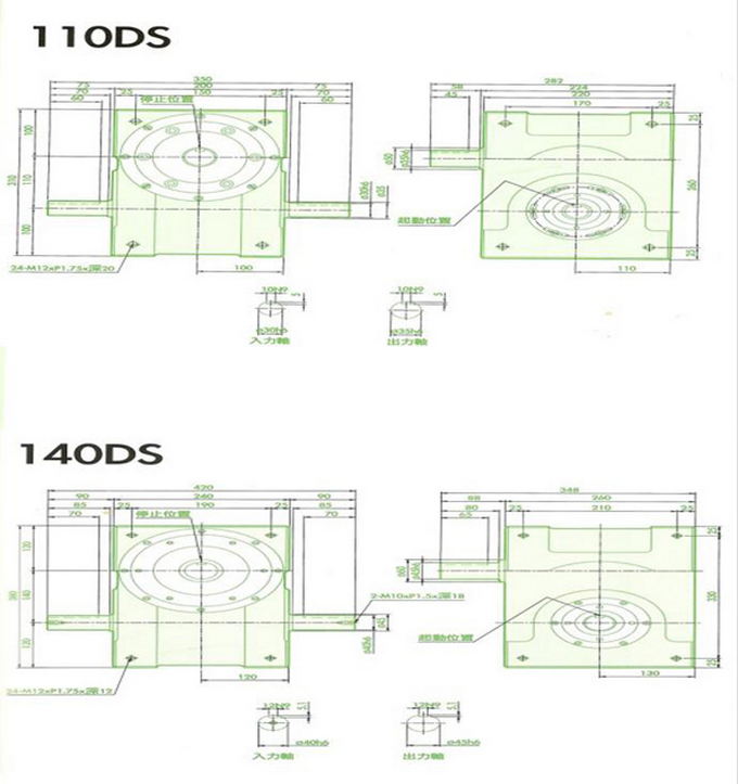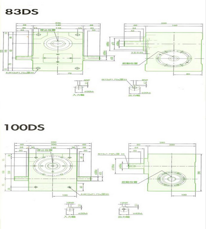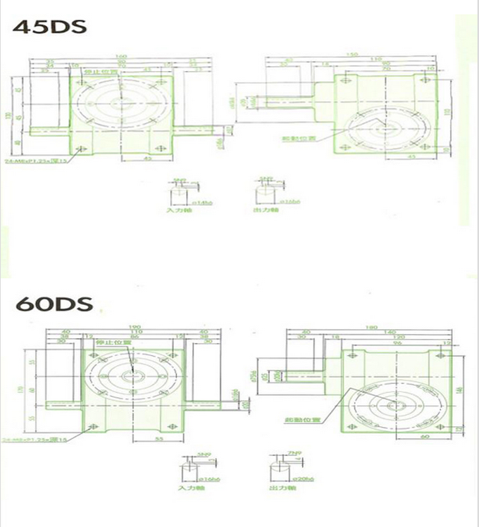 心轴型凸轮间歇分割器:此系列机种为典型传统心轴造型,其安装配件之加工安装配合齿轮、联轴或联轴盘,需特别注意孔径公差(+0.015/-0)及键槽公差(+0.015/-0,其使用场合在输送带驱动、齿轮驱动、无间隙联轴器结合驱动居多。 心轴型凸轮间歇分割器的规格型号有:心轴型45DS,心轴型60DS,心轴型70DS,心轴型80DS,心轴型83DS心轴型, 100DS,心轴型110DS心轴型,125DS心轴型,140DS心轴型150DS,心轴型180DS,心轴型200DS