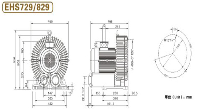 EHS729/829 离心式高压鼓风机特点:压力高 风量大 无油气 免保养 寿命长 低震动,高风压 体积小,重量轻 低噪音,新设计规格:三相交流电 50HZ/60HZ 最大风量:5.2立方米/6.2立方米功率:2200W/2600W 电压:200-240V/220-240V 346-415V/380-480V 电流:6.7A/10.6A 5.6A/6.1A