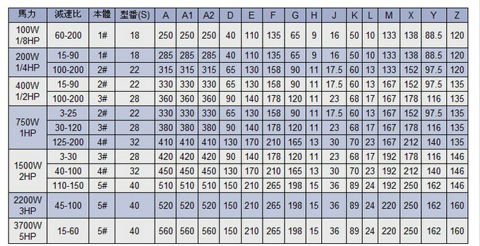 台湾 CPG 城邦二代立式(标准/缩框)三相刹车马达减速机规格如下: